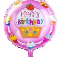 Happy Birthday 18 Inch Round Foil Balloon Pink with Cupcakes
