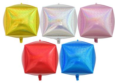 A 4D/3D 22 inch cube shaped foil balloon with a glitter effect design. This balloon can be inflated with either air or helium. Please see balloon guide for details.