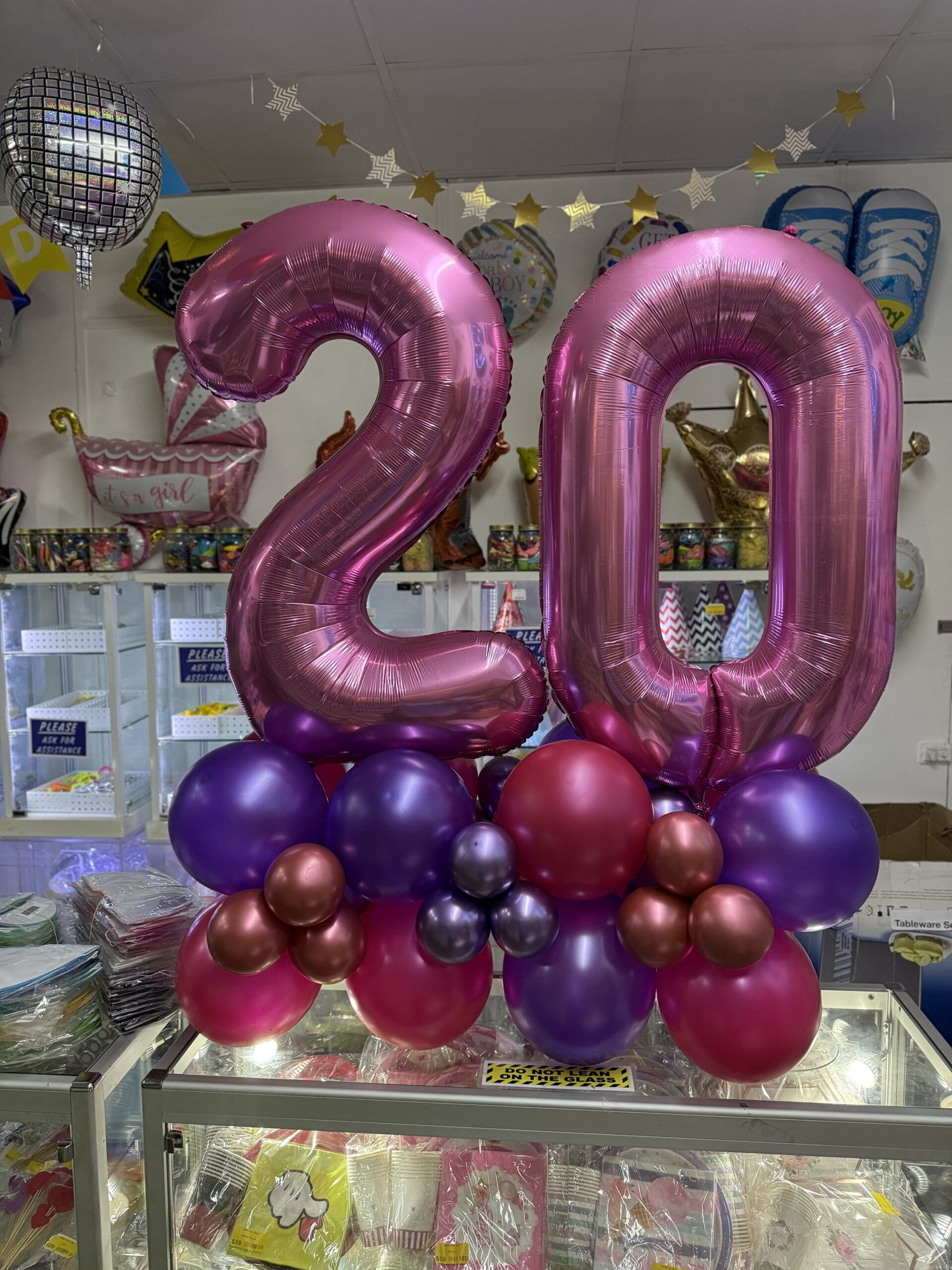 Double digit 40″ number foil balloon of your choice with a base consisting of matching coloured 12″ latex balloons with 5″ latex balloons for accents. All balloons will be inflated with regular air and two weights will be attached to the entire display for stability. The display will not float.