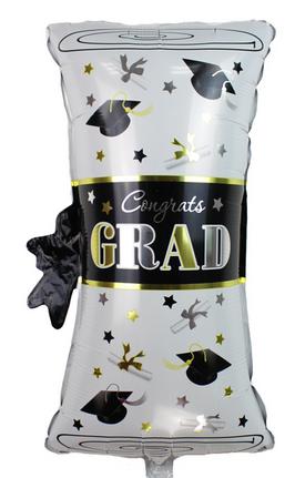 27 inch black and white graduation diploma-shaped foil balloon. Can be inflated with either air or helium. Please see balloon guide for details.