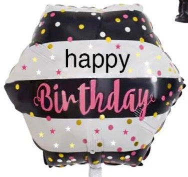 Hexagon-shaped 18 inch birthday-themed foil balloon with black and white stripes with gold dots print. Can be inflated with either air or helium. Please see balloon guide for details.