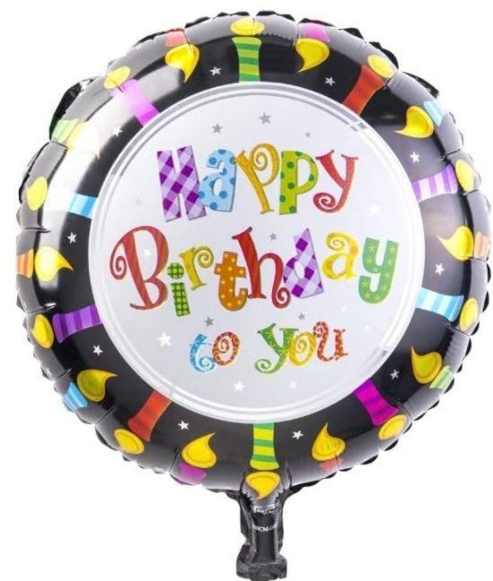 Happy birthday 18 inch round black with colourful candles foil balloon. Can be inflated with either air or helium. Please see balloon guide for details.