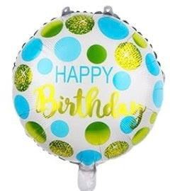 Happy birthday 18 inch round blue and gold dots foil balloon. Can be inflated with either air or helium. Please see balloon guide for details.