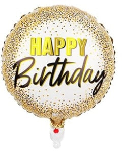 Happy birthday 18 inch round white with gold dotted edge foil balloon. Can be inflated with either air or helium. Please see balloon guide for details.