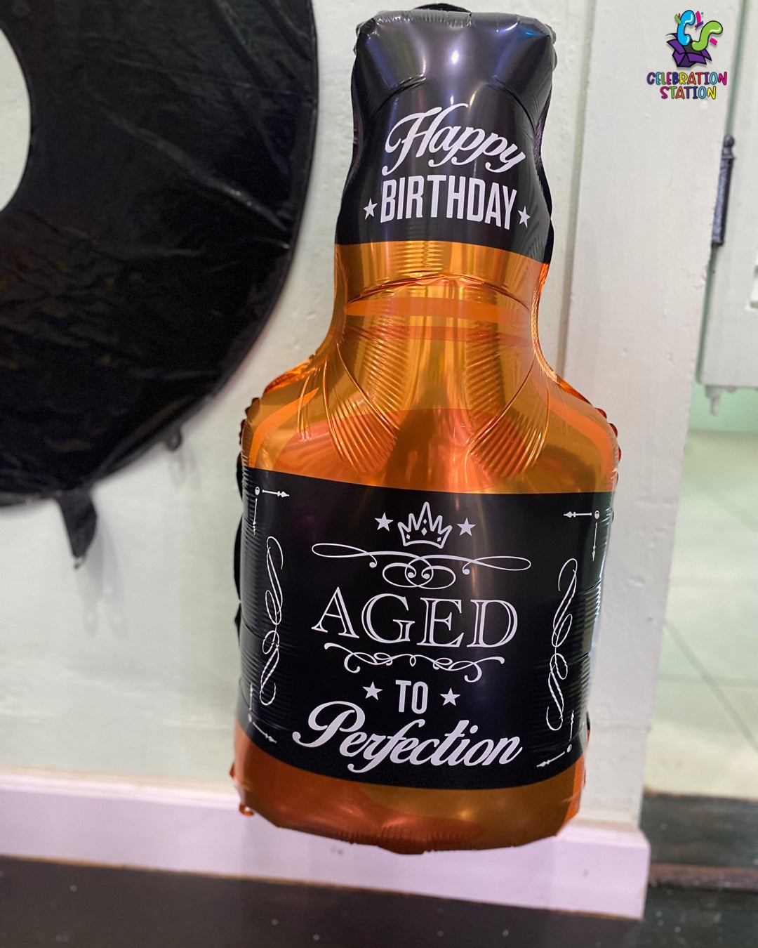 Happy birthday “Aged to Perfection” whiskey bottle-shaped foil balloon. Can be inflated with either air or helium. Please see balloon guide for details.