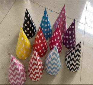 Cardboard party hats with polka dots or zig zag patterns.